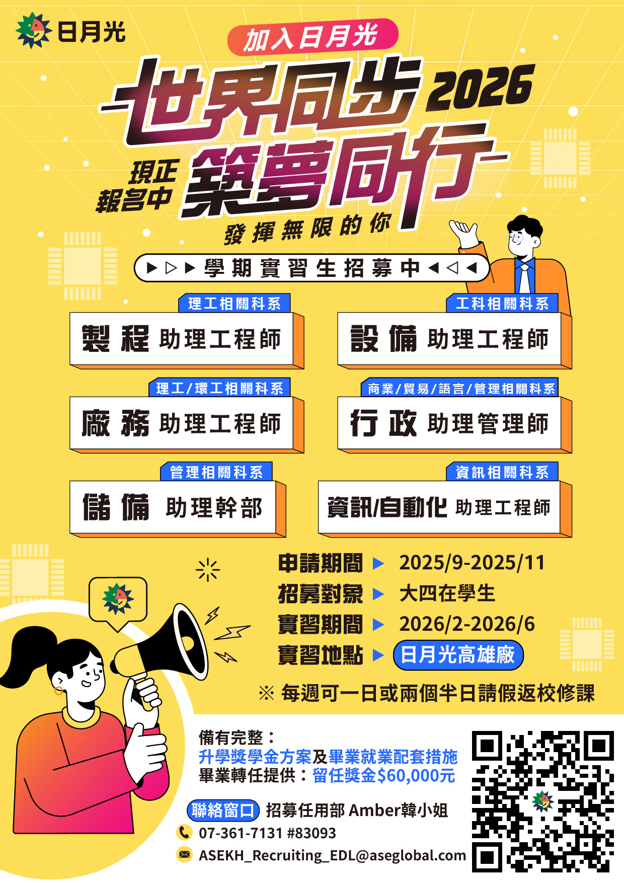 如果你對實習充滿熱情並有志於發展職場技能,歡迎加入日月光的團隊,踴躍報名參與!不僅能學以致用,還有機會為你的職業生涯奠定基礎。